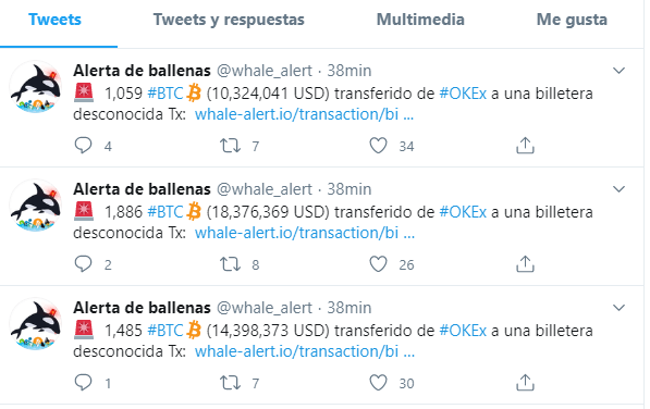 Depuis une heure environ, les baleines Bitcoin continuent de jouer le jeu. En seulement 3 opérations, OKEx a transféré plus de 4000 CTB à des portefeuilles inconnus.