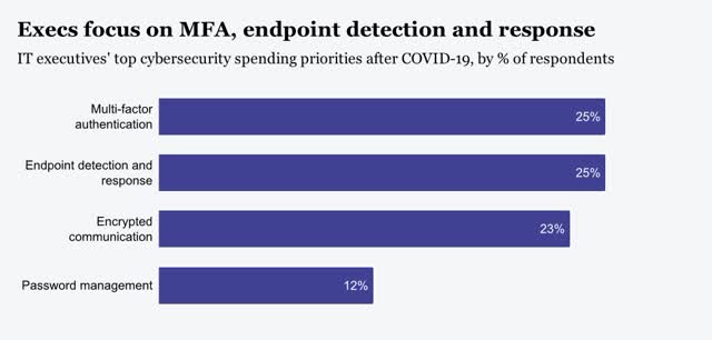 En outre, les responsables informatiques se concentrent désormais sur l’authentification multifactorielle (25 % des répondants) et sur la détection des points d’extrémité et la réponse (également, 25 % des répondants). Ceci est directement bénéfique pour le CRWD, puisque près de la moitié de ses modules en nuage (5 sur 11) se trouvent dans ce dernier segment. C’est également le segment principal du CRWD, et je pense que la majorité de ses revenus proviennent de ce segment.