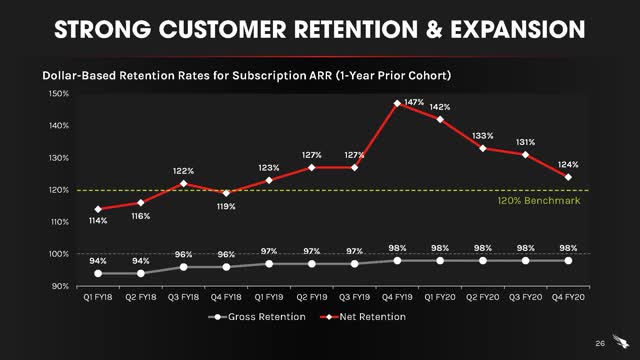 L’un des facteurs qui distinguent la CRWD des autres est son taux de rétention brut. Pour une société SaaS, le taux de rétention brut mesure la part de sa clientèle initiale qui reste à bord après 12 mois. Au cours de l’exercice 2020, CRWD a pu conserver 98 % de ses clients initiaux. En comparaison, Zoom Communications et Datadog (DDOG) – deux sociétés SaaS dont le profil de croissance est similaire à celui de CRWD – ont obtenu respectivement 96 % et 93 %.