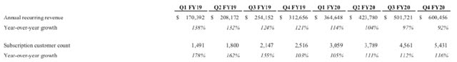 Aujourd’hui, CRWD est l’une des sociétés SaaS publiques qui connaît la plus forte croissance aux États-Unis. Selon sa dernière publication de résultats, la société a généré des revenus de ~480 millions de dollars, soit environ 90% de plus qu’il y a trois ans et presque dix fois plus qu’il y a trois ans – c’est fantastique. En outre, la société a pu prendre des parts de marché auprès des fournisseurs traditionnels année après année, affichant une croissance annuelle de sa clientèle supérieure à 100 % au cours des quatre dernières années.