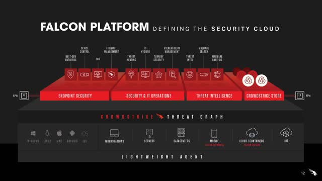 CrowdStrike a été fondé fin 2011 par un entrepreneur en cybersécurité (George Kurtz), son ancien directeur financier (Gregg Marston) et un expert en cybersécurité (Dmitri Alperovitch) dans le but de tirer profit des faiblesses des logiciels des anciens fournisseurs et de perturber le marché de la sécurité des terminaux. La proposition de valeur du CRWD est la plate-forme Falcon, qui se compose d’un agent léger fonctionnant sur un point d’extrémité – un ordinateur ou un portable, par exemple – d’une base de données dynamique dans le nuage appelée Threat Graph, et de onze modules dans le nuage effectuant diverses tâches de sécurité.