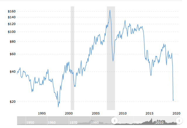 Le prix du pétrole brut du Texas occidental a baissé de 8 % vendredi, à 18,27 dollars le baril, et nous n’avions pas vu des prix aussi bas depuis 1998. Les prix sont en baisse de plus de 60 % pour 2020. Aucune reprise n’est en vue – les réductions d’approvisionnement de l’OPEP n’ont rien fait pour arrêter la chute libre des prix.