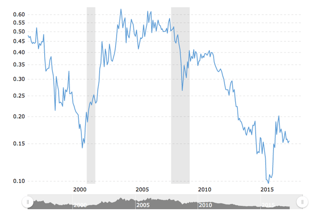 La meilleure façon de suivre la valeur des mineurs d’or par rapport à l’or est le rapport HUI/or. Ce ratio prend une action du NYSE Arca Gold Bugs Index (HUI), qui est un panier des principales sociétés d’extraction d’or, et la divise par une once d’or.