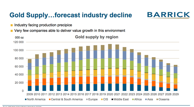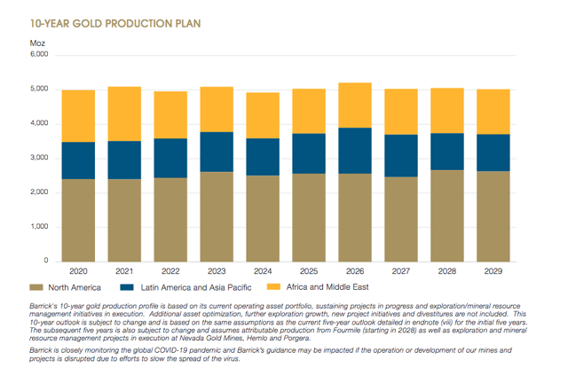 Prenons l’exemple de Barrick Gold (GOLD). Ce grand producteur d’or a publié son rapport annuel 2019, qui comprend ses objectifs de production sur dix ans. Notamment, Barrick ne prévoit aucune croissance au cours des 10 prochaines années – elle prévoit de produire 5 millions d’onces d’or cette année, et 5 millions d’onces d’ici 2029.