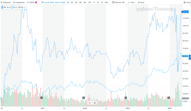 Par exemple, de début 2016 à aujourd’hui, le prix de l’or a augmenté de 59,81 %, contre 118,22 % pour le GDX (sans compter les dividendes qu’il a versés). L’or est passé de 1 090 à 1 694 dollars l’once, mais le GDX est passé de 14,12 à 30 dollars par action. Les mineurs d’or ont également surpassé l’or pendant plusieurs années après la crise financière de 2008.