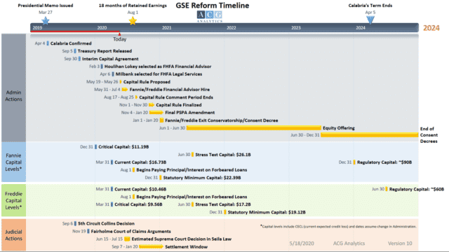 L’administration Trump semble mettre en scène cette situation de manière à ne pas avoir à faire quoi que ce soit de controversé avant l’élection de cette année, mais quoi qu’il en soit, le résultat mettra ces entreprises sur une voie irréversible de sortie de la tutelle. Le big bang, c’est la réduction de valeur des actions privilégiées de premier rang et le remboursement des trop-payés aux EGE comme moyen de neutraliser la grande majorité des poursuites contre la façon dont le gouvernement a comptabilisé les conservatoires de Fannie et Freddie, dans l’esprit de prendre la seule action non monétaire qui ouvre la voie à Fannie et Freddie pour pouvoir réunir les capitaux nécessaires pour sortir de la conservation. Sans cela, Fannie et Freddie ne pourront pas lever de capitaux, ce qui va à l’encontre de l’objectif qui consistait à élaborer le plan l’année dernière, à arrêter le balayage comme étape intermédiaire du plan, à engager un cabinet d’avocats et un conseiller financier et à élaborer maintenant une règle en matière de capital.