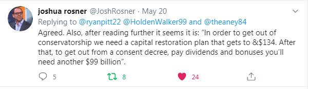 Josh Rosner, qui a mis au point le cadre de recapitalisation original sur lequel le plan Moelis a ensuite été basé, a commenté sur la faisabilité du capital nécessaire pour sortir Fannie et Freddie de leur statut de conservateur :