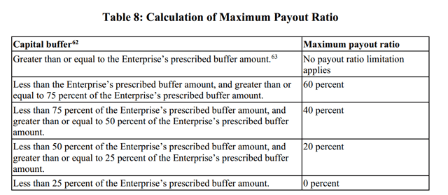Si une Entreprise est soumise à un ratio de distribution maximum, les restrictions de distribution s’appliquent à toutes les distributions de capital, ce qui s’étend généralement aux dividendes ou aux paiements sur, ou aux rachats d’instruments de capital de niveau 1 ou 2 du TEC1 (sauf, en ce qui concerne un paiement sur un instrument de capital de niveau 2, si l’Entreprise n’a pas toute latitude pour suspendre de façon permanente ou temporaire ces paiements sans déclencher un cas de défaillance). Les restrictions de paiement s’étendraient également aux primes discrétionnaires, définies de manière large pour inclure tout paiement effectué à un cadre dirigeant d’une entreprise, lorsque l’entreprise conserve la discrétion d’effectuer ou non le paiement et le montant de celui-ci, que le montant payé est déterminé par l’entreprise sans promesse préalable ou accord avec le cadre dirigeant et que le cadre dirigeant n’a pas de droit contractuel au paiement.