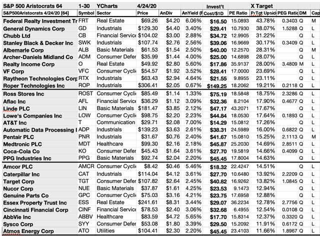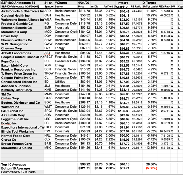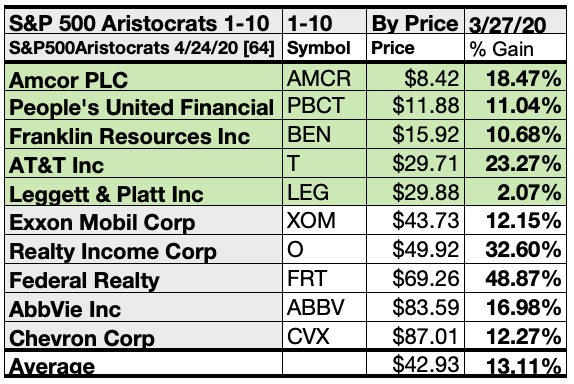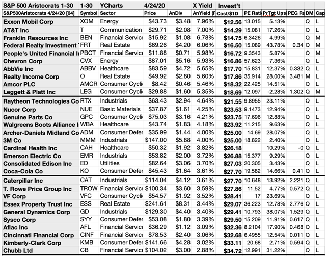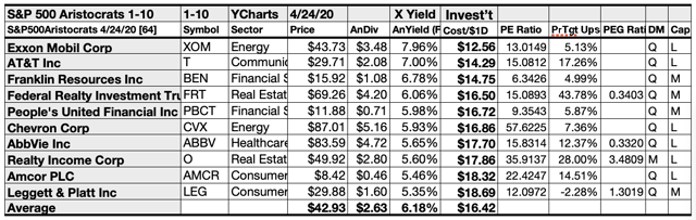 Les 10 premiers aristocrates sélectionnés 4/24/20 par rendement représentaient six des 11 secteurs de Morningstar. Deux énergie ont été placés en première et sixième position, Exxon Mobil (XOM) [1]et, Chevron (CVX) [6]. En deuxième position se trouve AT&T, Inc. [3]le seul les services de communication dans le top 10.