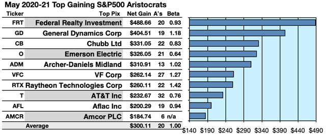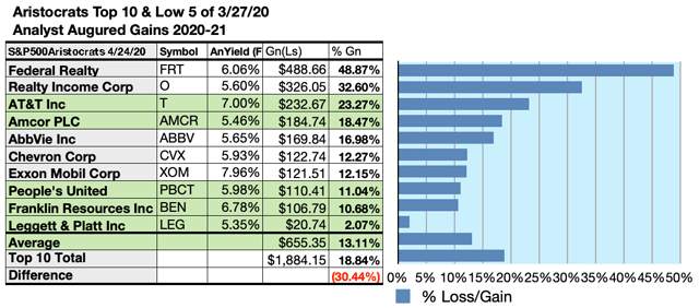 Conclusions exploitables : Les analystes ont estimé que les cinq plus bas prix parmi les 10 Rendement le plus élevé Les aristocrates du dividende (33) délivrent 13,11% Vs. (34) 18.84% Gains nets par All 10 par Mai 2021