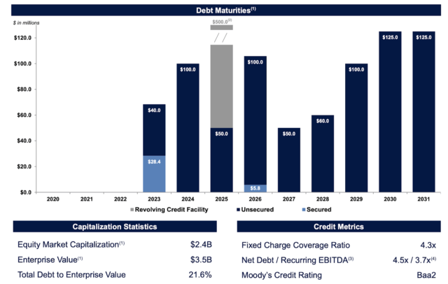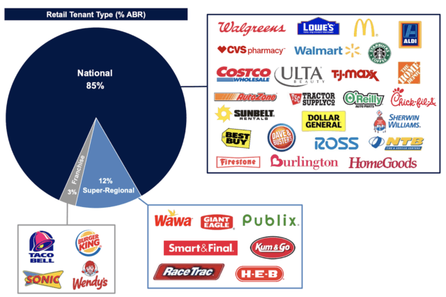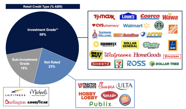 Par rapport à ses pairs, le REIT a un niveau de locataires de qualité nettement plus élevé, et son orientation vers les chaînes nationales diffère de celle de ses pairs vers les petits locataires :