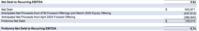 On peut supposer sans risque que l’ADC a l’intention de maintenir un ratio de levier autour de son niveau actuel. Si l’ADC n’investissait que ses 800 millions de dollars en liquidités dans des biens immobiliers à un taux plafond de 6,4 %, l’EBITDA augmenterait de 51 millions de dollars et le ratio dette/EBITDA diminuerait à environ 3,8. Si ADC voulait maintenir son ratio d’endettement de 4,8 fois, elle pourrait alors émettre 353 millions de dollars de dette supplémentaire pour un pipeline d’acquisition total de 1,15 milliard de dollars. Cela donnerait un coup de pouce de 73,6 millions de dollars en EBITDA ou potentiellement 59 millions de dollars en fonds de roulement supplémentaires, en supposant un taux d’intérêt moyen de 4 % sur la dette. Les fonds provenant de l’exploitation ajournée de 2020 s’élèveraient à environ 3,25 dollars par action. Il pourrait même y avoir un potentiel d’augmentation de ce chiffre si l’environnement actuel permet à l’ADC d’acquérir des propriétés à des taux de plafonnement supérieurs à 6,4 %, ce qui pourrait très bien être possible compte tenu de l’environnement difficile.