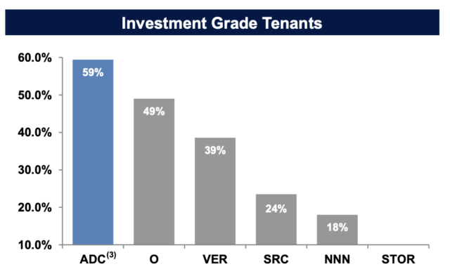 L’ADC possède 864 propriétés de détail à bail net dans 46 États. Elle se distingue des autres sociétés de placement immobilier NNN par le fait que ses locataires sont de qualité nettement supérieure. Nous pouvons voir ci-dessous que 59 % de ses locataires sont de qualité investissement et comprennent des sociétés à haut degré de solvabilité comme Home Depot (HD) et Costco (COST) :