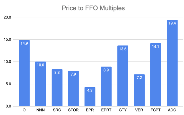 Sur la base de mes fonds provenant de l’exploitation ajustés pro forma 2020 de 3,25 dollars, l’ADC se négocie à 18,5 fois les fonds provenant de l’exploitation ajustés à terme et à un taux de rendement de 3,9 %. Il se négocie avec une prime significative par rapport à ses pairs, comme nous le voyons ci-dessous :