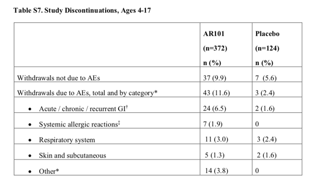 Palforzia a également obtenu d’excellents résultats lors d’essais. En prenant des patients de base ayant une tolérance médiane de 10 mg aux cacahuètes, Palforzia a pu augmenter progressivement cette tolérance à 1000 mg en 12 mois. Ce niveau de désensibilisation est presque légendaire en médecine, et c’est ce que les allergologues espéraient autrefois seulement obtenir. Cependant, voici un article de Seeking Alpha qui traite de certaines lacunes dans les données de l’essai. (Assez étrange : je ne vois pas cet article listé sous le profil de l’auteur). J’ai vérifié quelques références de l’article et je n’ai pas pu les trouver. Par exemple, l’auteur dit : « Inexplicablement, 21% des patients du groupe Palforzia ont abandonné l’étude contre 8,0% des patients du groupe placebo ». J’ai cliqué sur ce lien, j’ai trouvé un tableau pour l’arrêt des études (ci-dessous) mais je n’ai pas pu trouver ces points de données particuliers. Peut-être qu’il me manque quelque chose.