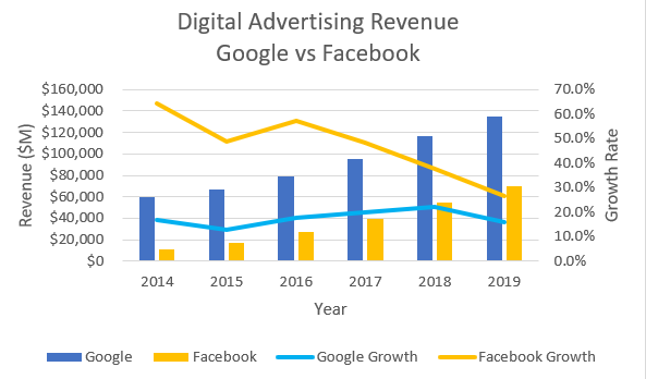 Le graphique montre la croissance spectaculaire des revenus de Google et de Facebook au cours des dernières années, mais on peut clairement voir que la croissance ralentit pour les deux entreprises. Elle est encore très saine, mais nous nous dirigeons rapidement vers des taux de croissance à un chiffre.