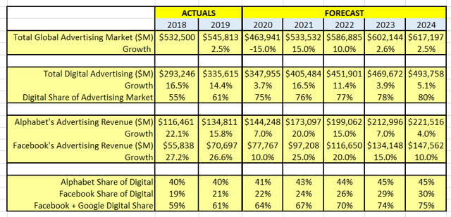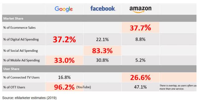 Le marché de la publicité numérique est essentiellement un duopole entre Google et Facebook (NASDAQ:FB), Amazon (NASDAQ : AMZN) occupant une lointaine troisième place. Le tableau suivant en témoigne :