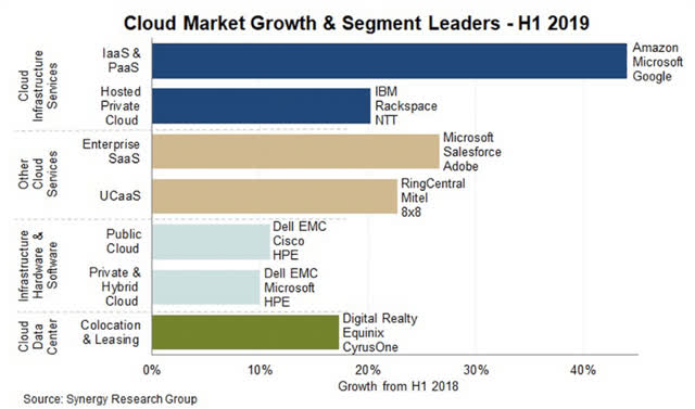 Il y a au moins 4 segments dans l’espace du cloud computing selon le Synergy Research Group qui a publié le graphique suivant montrant chaque segment et leurs principales entreprises :
