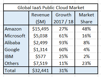 Fin 2018, le Gartner Group a également estimé les parts de marché des principaux acteurs du segment IaaS :