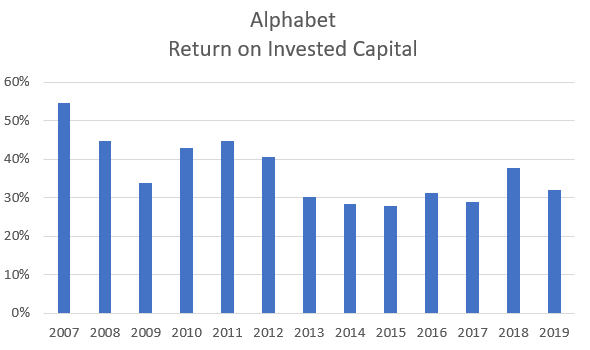 L’historique du rendement ajusté du capital investi pour Alphabet est :