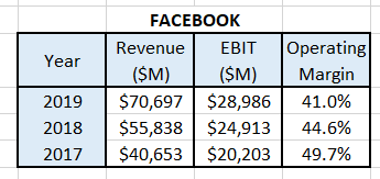 Il est utile de comparer les marges d’exploitation rapportées par Alphabet à celles de son principal concurrent publicitaire, Facebook :