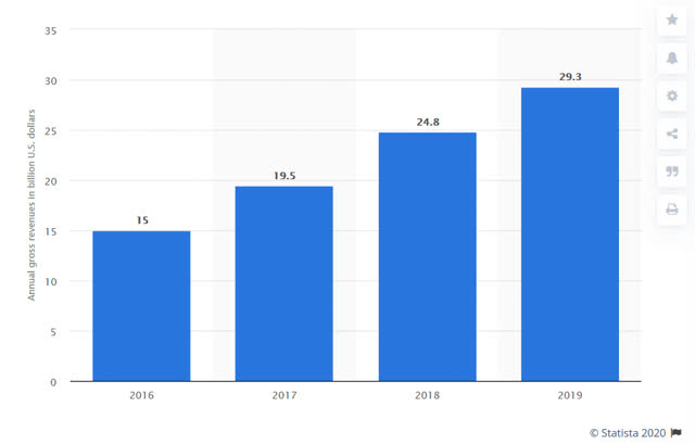 Cette division regroupe tous les revenus de Google sur le marché des appareils Android. Statista a publié le graphique suivant qui montre les revenus bruts mondiaux des applications Google Play au cours des 4 dernières années :