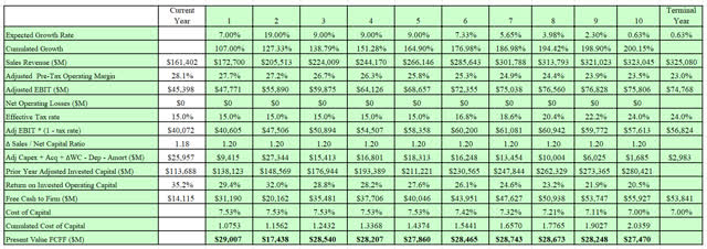 - Le rendement actuel du capital d’exploitation investi de 31,9 % diminuera au fil du temps avant de s’établir à 12 ± 1 % à perpétuité. Ce rendement sera supérieur au coût du capital d’Alphabet, reflétant ainsi la solidité du fossé de l’entreprise.