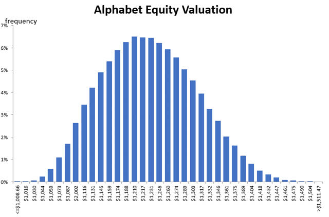 La simulation indique qu’à un taux d’actualisation de 7 %, l’évaluation de l’alphabet se situe entre 1 009 et 1 512 dollars par action, avec une valeur prévue de 1 225 dollars.