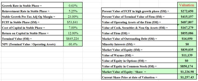 - Je n’ai attribué aucune valeur supplémentaire aux autres entreprises classées dans la catégorie « Autres paris ». Il est clair que cela présente un certain potentiel d’augmentation de la valeur d’Alphabet si une autre entreprise de la catégorie Autres paris peut être monétisée.