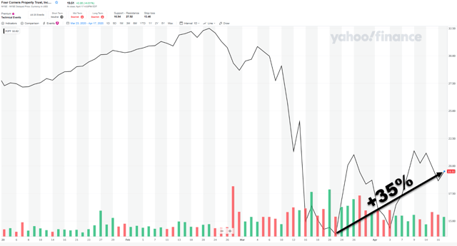 L’un des premiers échanges de COVID-19 que nous avons fait est celui de Four Corners, une société de placement immobilier à bail net qui a eu une exposition démesurée à Darden Restaurants (DRI). Le portefeuille de locataires est à 72% de qualité investissement (par loyer de base annualisé) avec des tendances d’exploitation positives, avec le deuxième plus fort EBITDAR locataire à la couverture des loyers (de 4,8x) dans le secteur des REIT à bail net. Comme expliqué à l’iREIT sur les membres Alpha, « nos principales raisons d’inclure dans le portefeuille « Cash Is King » sont