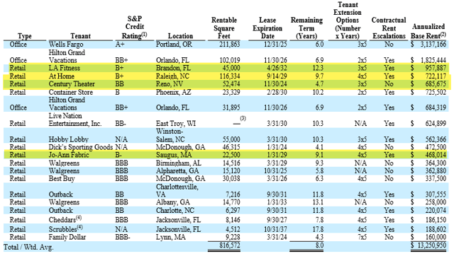 Comme vous pouvez le voir, PINE a quelques locataires à haut risque dans son portefeuille (que j’ai ombré en jaune) tels que Hilton Grand Vacations, LA Fitness et The Container Store. J’ai décidé d’examiner de plus près le 10-K afin de déterminer les locataires les plus à risque pendant la pandémie COVID-19 :