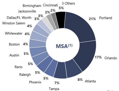 La plupart du portefeuille de PINE a des locataires de qualité et la durée moyenne des baux (pour le portefeuille) est de 8,5 ans. 83% des RBA proviennent de locataires situés dans des MSA de plus d’un million d’habitants, comme indiqué ci-dessous :