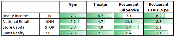 Nous avons récemment mené des entretiens avec un certain nombre de PDG de sociétés de placement immobilier à bail net, notamment Sumit Roy de Realty Income, Chris Volk de Store Capital et Jackson Hsieh de Spirit Realty. Dans chacune de ces interviews, nous avons posé des questions sur l’exposition aux théâtres et aux salles de sport (catégorie bien-être). Comme nous le verrons plus loin, ces sociétés de placement immobilier ont une exposition variable à ces sous-secteurs à haut risque (de location nette) :