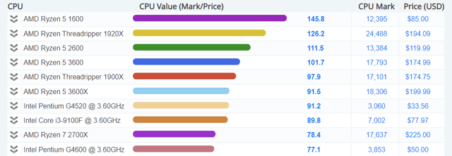 Voyons comment les produits AMD se positionnent par rapport à la concurrence. Pour avoir une idée de la valeur des produits d’AMD et de ses concurrents, nous pouvons examiner le rapport prix/performance des logiciels Passmark.