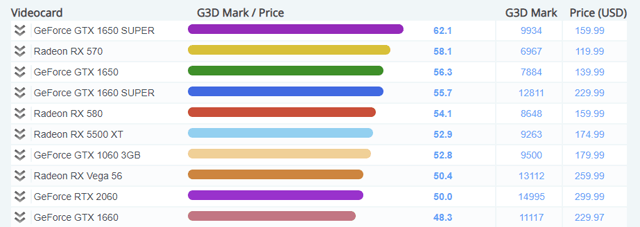 Source : Tableau des valeurs des cartes vidéo PassMark – Performance / Prix des cartes vidéo