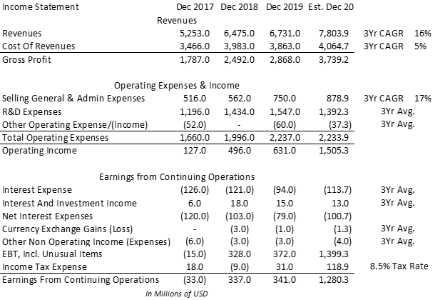 Pour estimer les bénéfices d’AMD en 2020, j’ai utilisé les résultats des trois dernières années de la société pour modéliser ce à quoi pourrait ressembler l’année prochaine. Pour certaines mesures, comme le chiffre d’affaires, j’ai utilisé le taux de croissance annuel composé (TCAC) sur trois ans. Pour d’autres, comme les dépenses de R&D, j’ai utilisé la moyenne simple sur trois ans. Vous trouverez ci-dessous les estimations.