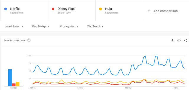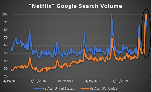 Bien que le marché puisse se tromper sur Tesla, il semble que Netflix ait raison. Bien sûr, je pense que le NFLX lui-même est surévalué et que sa dette élevée, adossée à des actifs incorporels, pose problème. Cela dit, Google Trends confirme que l’entreprise tire profit des commandes de COVID-19 pour les séjours à domicile.