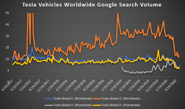 Comme vous pouvez le voir ci-dessous, le volume de recherche global pour chaque modèle Tesla a diminué de 30 % (modèle Y) à 65 % (modèle X) depuis la fin décembre :