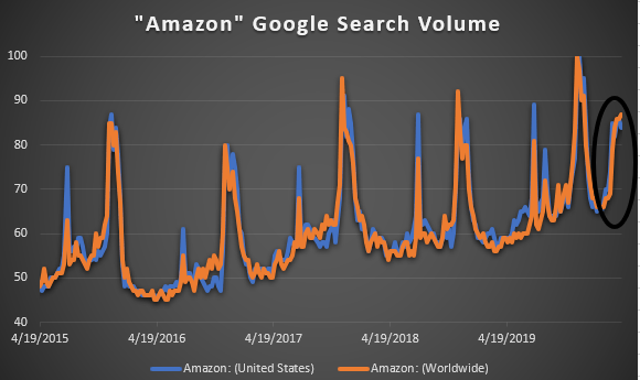 Comme vous pouvez le voir ci-dessous, le volume relatif de recherche pour « Amazon » aux États-Unis et dans le monde entier a vu un rebondissement de COVID-19 :