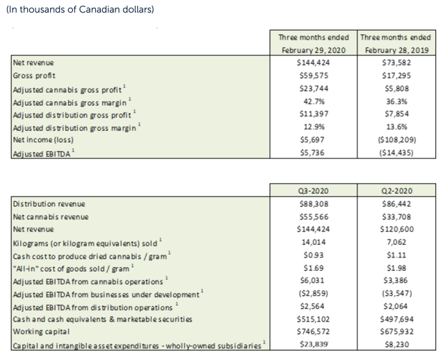 Pour le troisième trimestre, Aphria a généré des revenus nets de 144,4 millions de dollars canadiens, contre 120,6 millions de dollars canadiens au trimestre précédent. La société a même réduit le consensus des analystes à 130,8 millions de dollars canadiens, soit une somme énorme de 13,5 millions de dollars canadiens. La plupart des autres mesures financières étaient également solides.