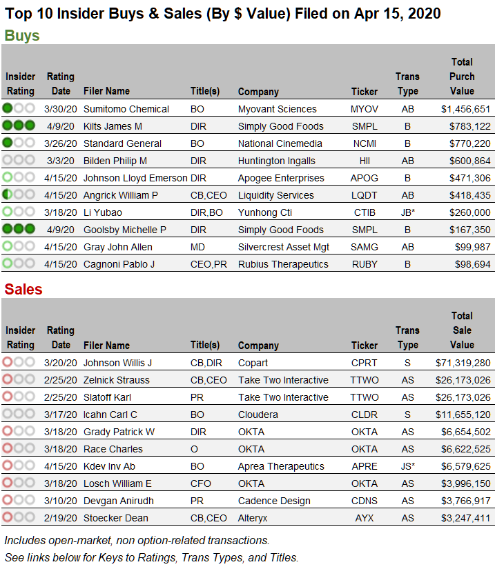 Note saisonnière : Les volumes de déclarations d’initiés sont en baisse saisonnière pour le reste du mois d’avril, car les sociétés ferment les fenêtres de négociation aux initiés jusqu’à la publication des résultats financiers du trimestre de mars. Les délits d’initiés reprennent en mai, mais il y a encore beaucoup de signaux de rentabilité à suivre de la part des initiés pendant les mois creux comme avril.