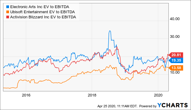 En comparant l’EV/EBITDA de ces trois sociétés, on constate qu’Electronic Arts se négocie à une valeur nettement supérieure à celle d’Ubisoft, mais à peine inférieure à celle d’Activision Blizzard (ATVI) :