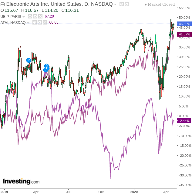 Depuis 2019, on constate que le titre a progressé de plus de 46 %, dépassant même Ubisoft qui, jusqu’à récemment, connaissait un rythme de croissance plus rapide qu’Electronic Arts :