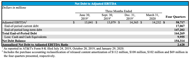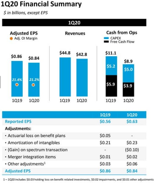 Le 22 avril 2020, AT&T a publié les résultats du premier trimestre 2020 qui n’ont pas respecté les estimations du consensus. La société a déclaré un BPA ajusté de 0,84 $ (manqué de 0,01 $) sur un chiffre d’affaires de 42,8 milliards de dollars (manqué de 1,37 milliard de dollars), ce qui n’est pas non plus comparable au trimestre précédent.
