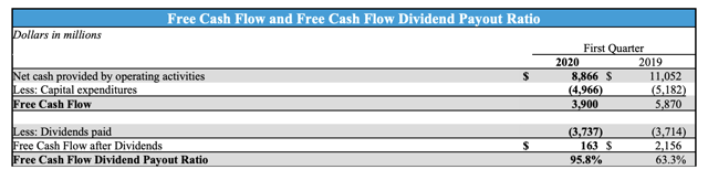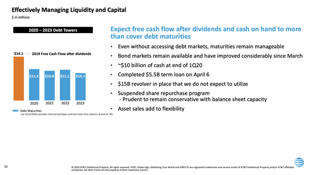 Alors que l’impact final sur les FCF annuels est en grande partie inconnu depuis qu’AT&T a retiré ses prévisions pour 2020, les flux de trésorerie trimestriels volatils ont diminué de 1,9 milliard de dollars au premier trimestre. La société a dépensé plus de 200 millions de dollars de moins en CapEx et n’a toujours pas pu rattraper la réduction de plus de 2,2 milliards de dollars des flux de trésorerie d’exploitation.