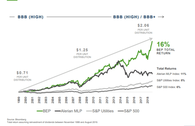 La société vise un rendement à long terme pour les actionnaires de l’ordre de 12 à 15 % et a pu se situer dans le haut de cette fourchette depuis plusieurs années. L’une des mesures clés qui alimentent cette croissance est le FFO, que Brookfield utilise pour augmenter ses dividendes et réinvestir dans la société. En 2019, les FFO ont augmenté de 13 %, ce qui est supérieur à leur moyenne à long terme de 10 %. Cette croissance a été obtenue grâce à un certain nombre de facteurs différents, notamment des gains d’efficacité opérationnelle de plus de 40 millions de dollars ainsi que de nouvelles acquisitions en ligne. Grâce aux efforts de recyclage déployés tout au long de l’année et qui n’ont pas été pris en compte dans les fonds de roulement, le BEP a pu investir 2 milliards de dollars supplémentaires dans son entreprise en 2019 et cherche à poursuivre sur cette lancée en 2020.
