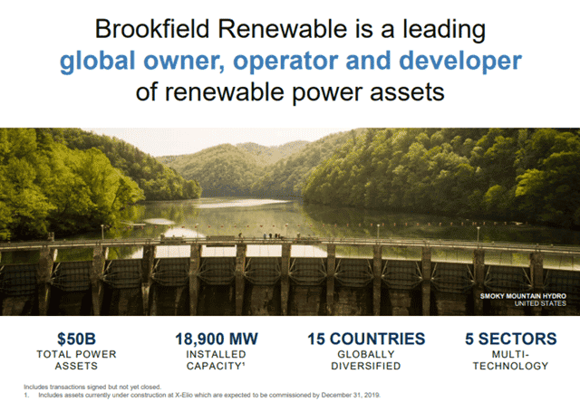 Brookfield s’identifie comme l’une des plus grandes entreprises d’énergie renouvelable au monde. Elle contrôle plus de 50 milliards de dollars d’actifs électriques au total, avec près de 19 000 MW de capacité installée dans 5 337 installations différentes. Elles travaillent actuellement dans 15 pays différents à travers le monde avec 3 000 employés et opèrent dans 5 secteurs différents, ce qui leur donne des capacités multitechnologiques. Ces technologies comprennent l’hydroélectricité, l’énergie éolienne, l’énergie solaire, la production décentralisée et le stockage.