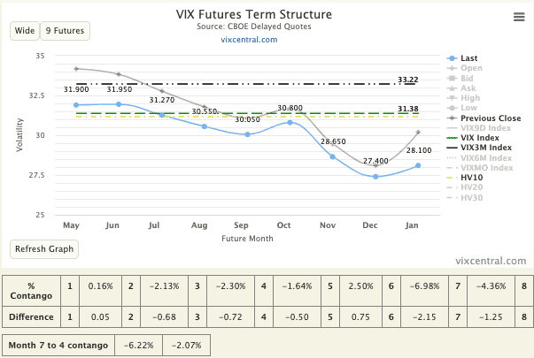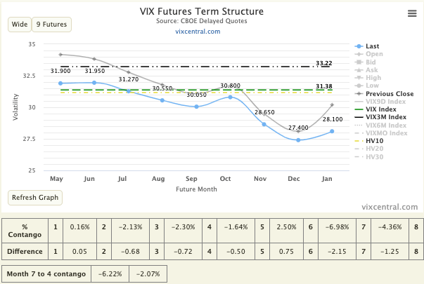 Les gains du mois dernier ont été graduels, tout comme la baisse des contrats à terme sur le VX. Cela dit, les changements se sont souvent produits de manière inégale – peu de mouvement pendant plusieurs jours suivi d’un déclin marqué. C’est le cas de l’action d’aujourd’hui pour la courbe des contrats à terme du VX.