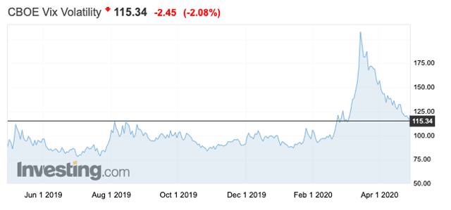 Ci-dessus, une photo de l’histoire du VIX en un an : « VVIX ». A 115 ans, on pourrait dire que la mesure a fait son « retour » en toute sécurité, après avoir franchi la barre des 200 à la mi-mars. Il est vrai que 115 est comparable à certaines périodes plus difficiles de l’année dernière, comme la période tumultueuse d’août 19.