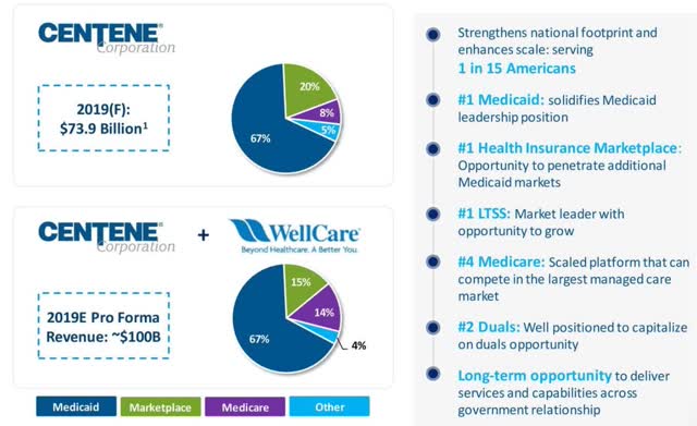 L’accord avec Wellcare fait de Centene la troisième plus grande société de soins de santé cotée en bourse aux États-Unis et double son exposition à Medicare. Centene dessert désormais un Américain sur quinze. Ses plans dans le cadre de Medicaid, Medicare et Medicare Part D, ainsi que la division du marché, s’adressent à 24 millions de personnes dans 40 États, Centene fournissant ses 3 plans dans 17 États, dont la Californie, la Floride, New York et le Texas.
